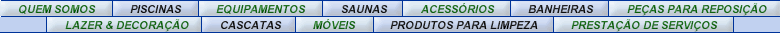 Trabalhamos com: Piscinas de Alvenaria, Fibra e Vinil; Equipamentos como Filtros e Bombas; Saunas à Vapor e à Gás; Aquecimento para piscinas; Trocadores de Calor; Iluminação Sub-Aquática; Acessórios como Aspirador, Cabos Telescópicos, Mangueiras Flutuantes, Ponteiras, Adaptadores, Peneiras, Escadas, Escovas e Skimmers; Banheiras; Peças de Reposição, Produtos para limpeza da piscina; Acessórios de Lazer e Decoração como Kit Vôlei, Kit Basquete, Bar Flutuante, Chafariz Flutuante, Duchas, Cascatas de embutir e de sobrepor e Cascatas decorativas; Móveis de Fibra e Prestação de Serviços.